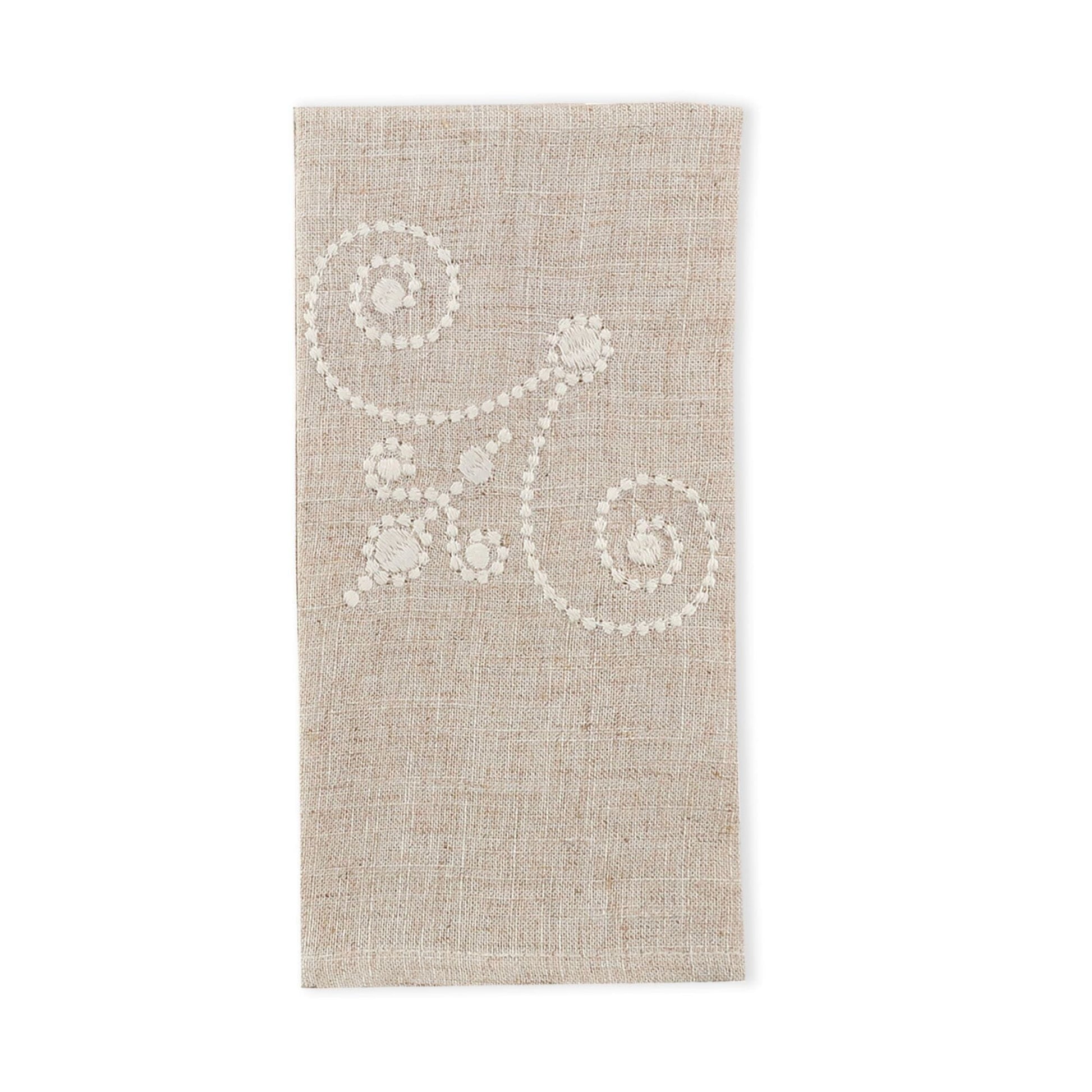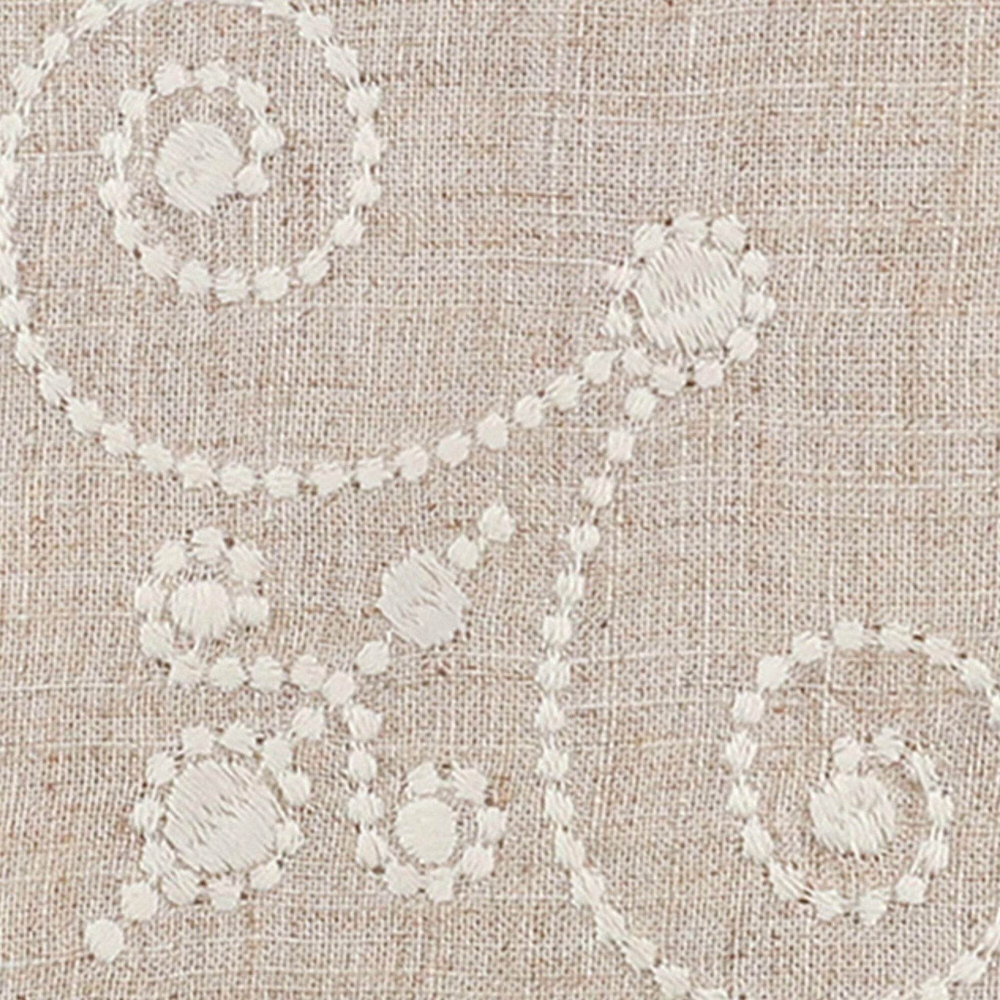 Elegant Embroidered Design: Showcases delicate white scroll and swirl embroidery on a linen-colored base for a timeless, romantic look.
