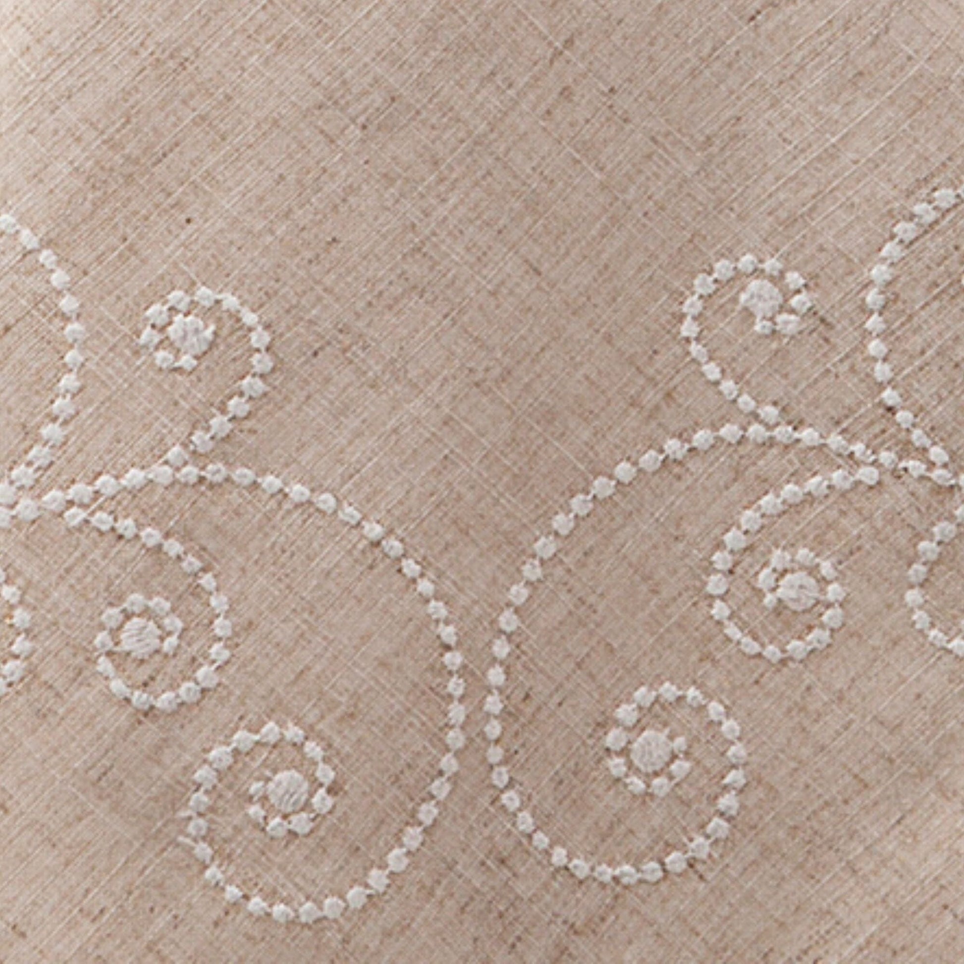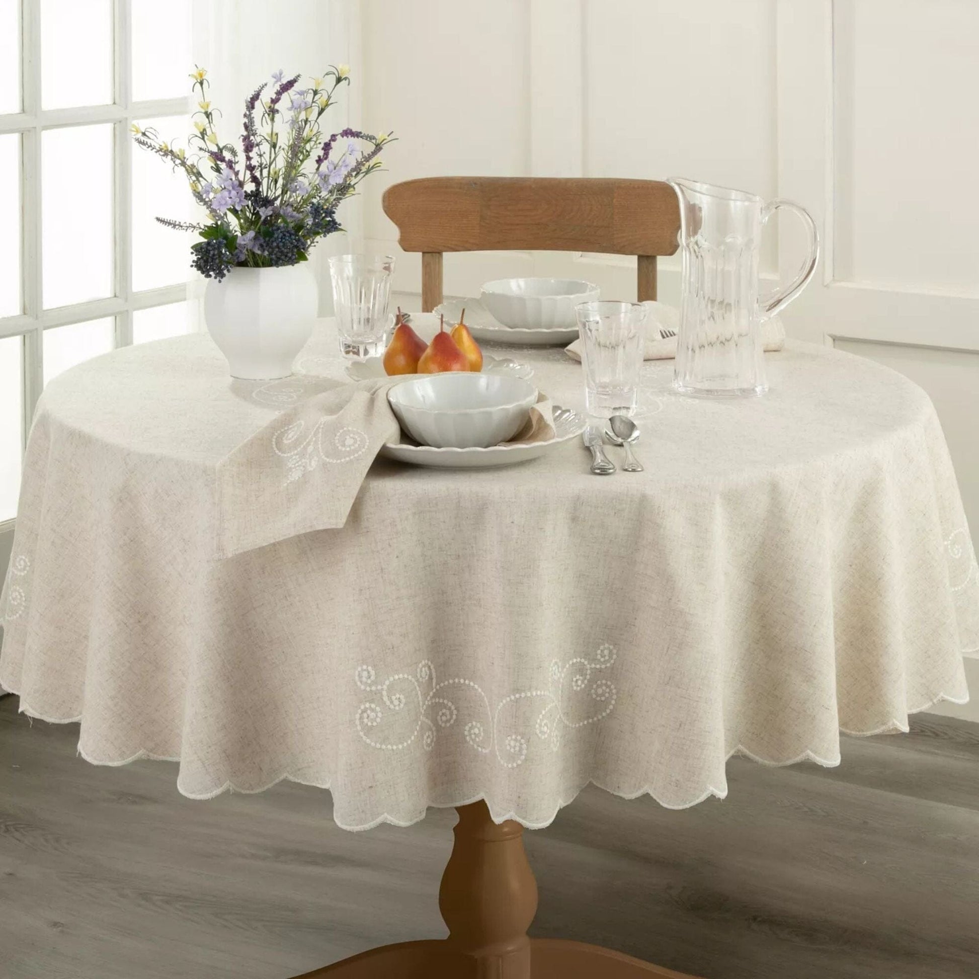 Inspired by classic French country charm, the Lenox French Perle Embroidered Tablecloth brings graceful beauty to any dining space. Featuring delicate embroidered scrolls and swirls at the center and corners, along with softly scalloped edges, this linen tablecloth offers a romantic yet refined finish—perfect for both casual meals and elegant entertaining. Crafted from a blend of 80% polyester and 20% linen, this dining table cloth combines the durability and easy care of polyester with the natural texture and drape of linen. Ideal for layering with French Perle napkins, placemats, table runners, and Lenox French Perle dinnerware for a beautifully coordinated tablescape.