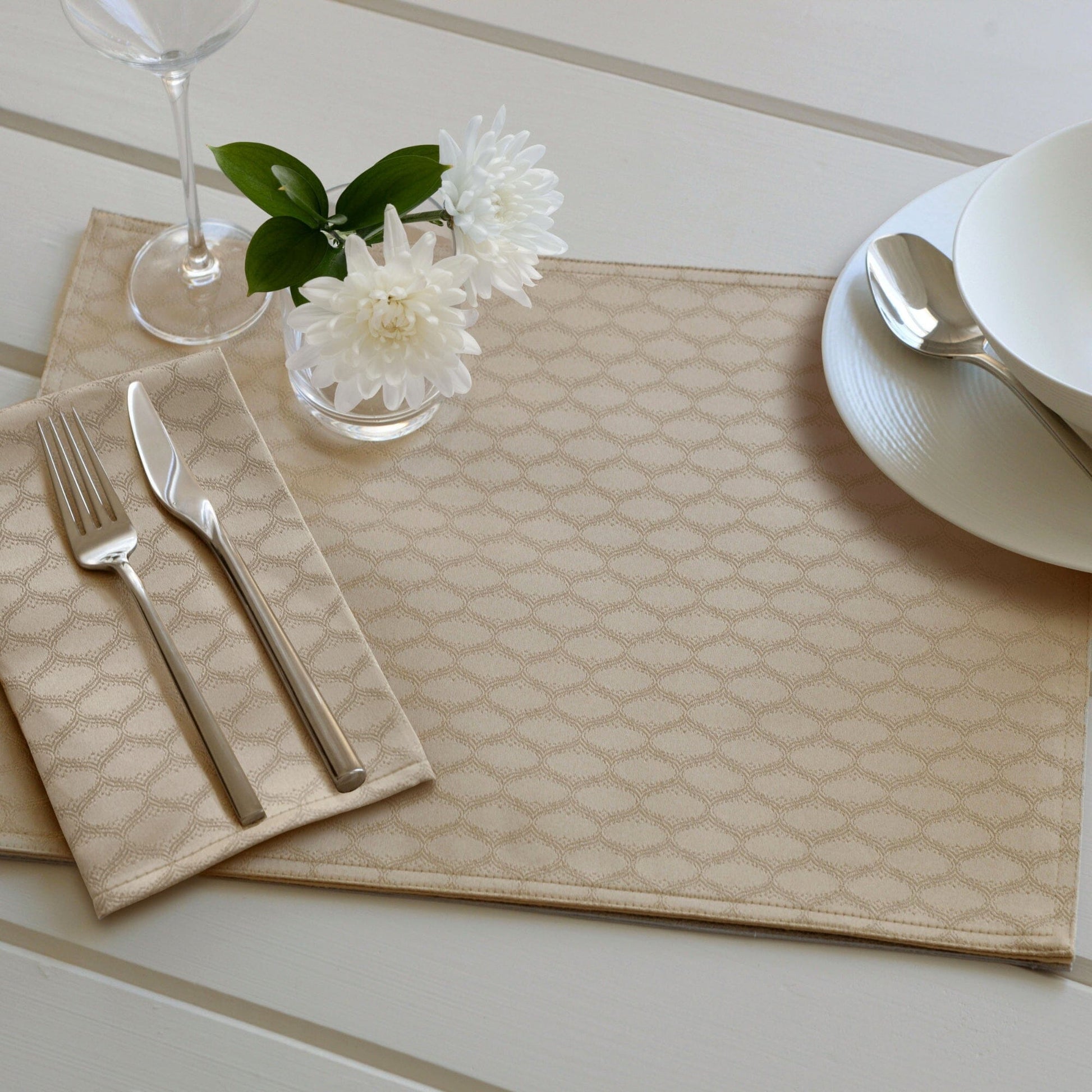 Elegant Lattice Design: Features an intricate, tone-on-tone lattice pattern with a lustrous finish that is sure to elevate any tablescape.