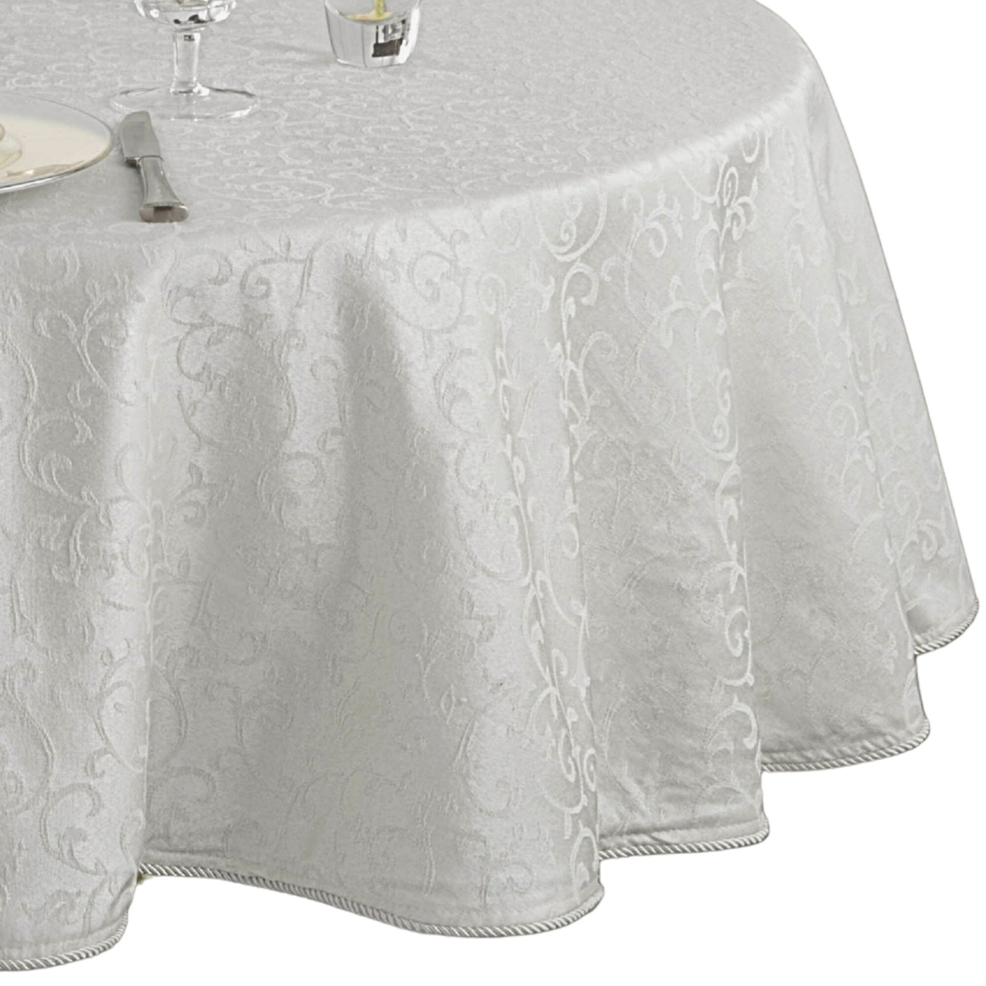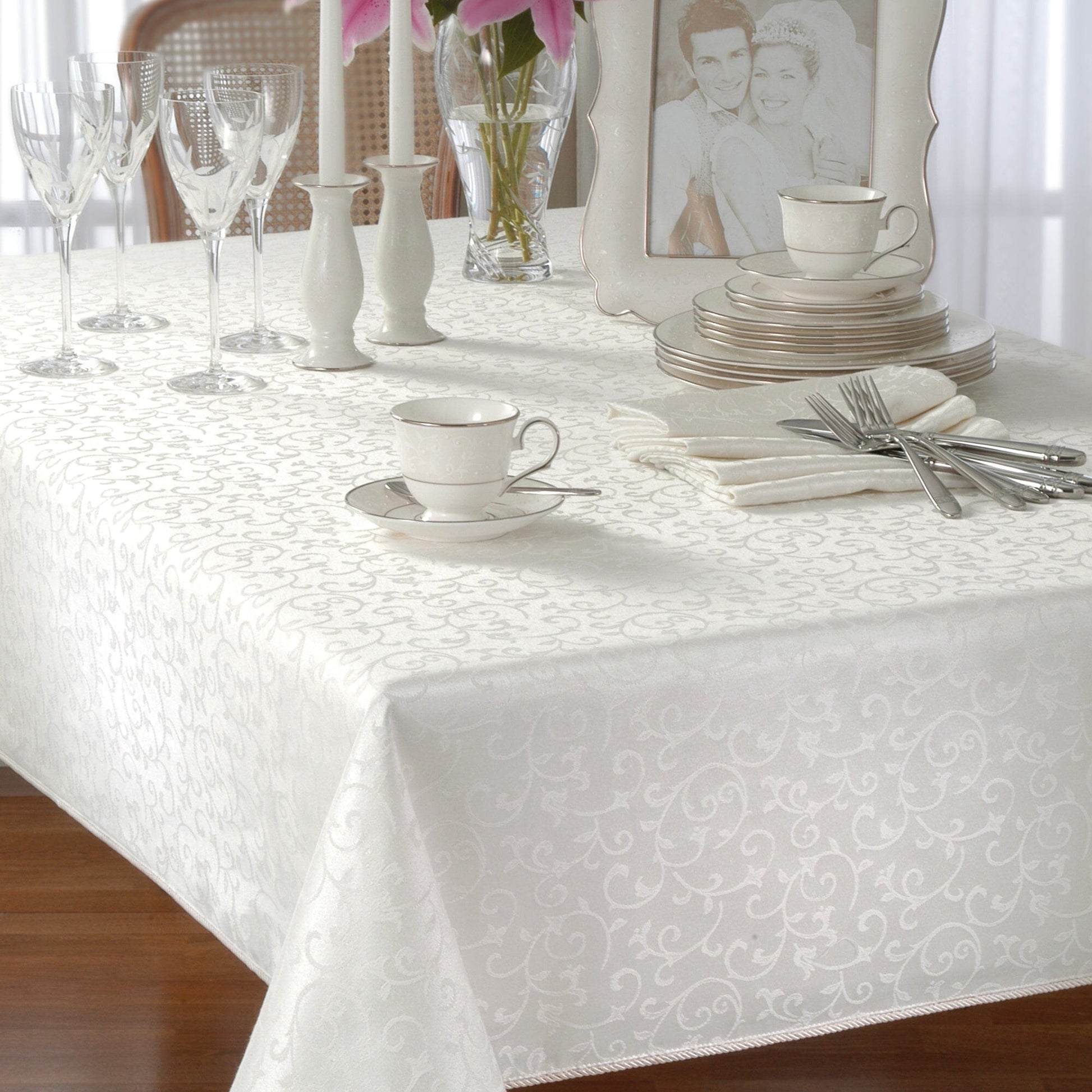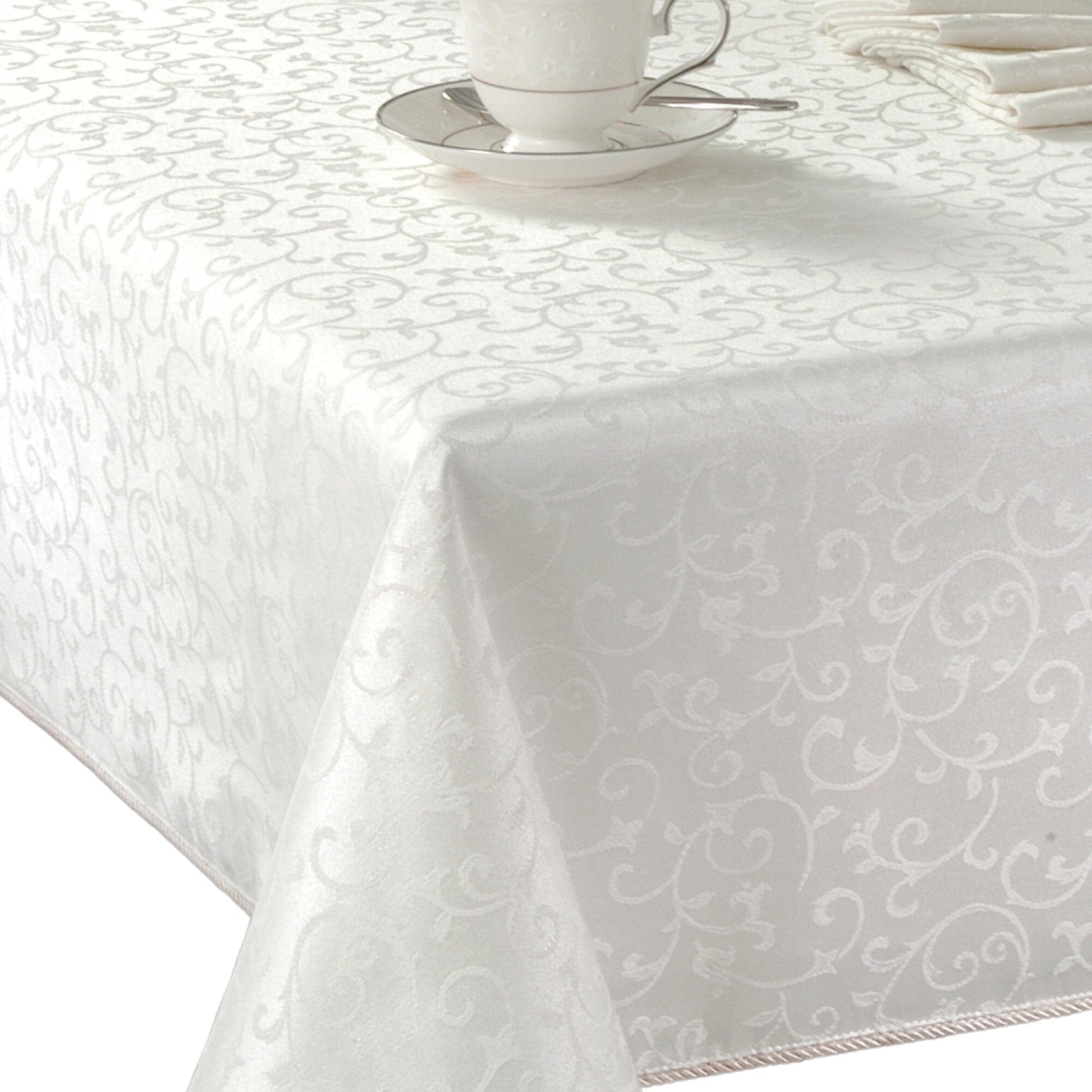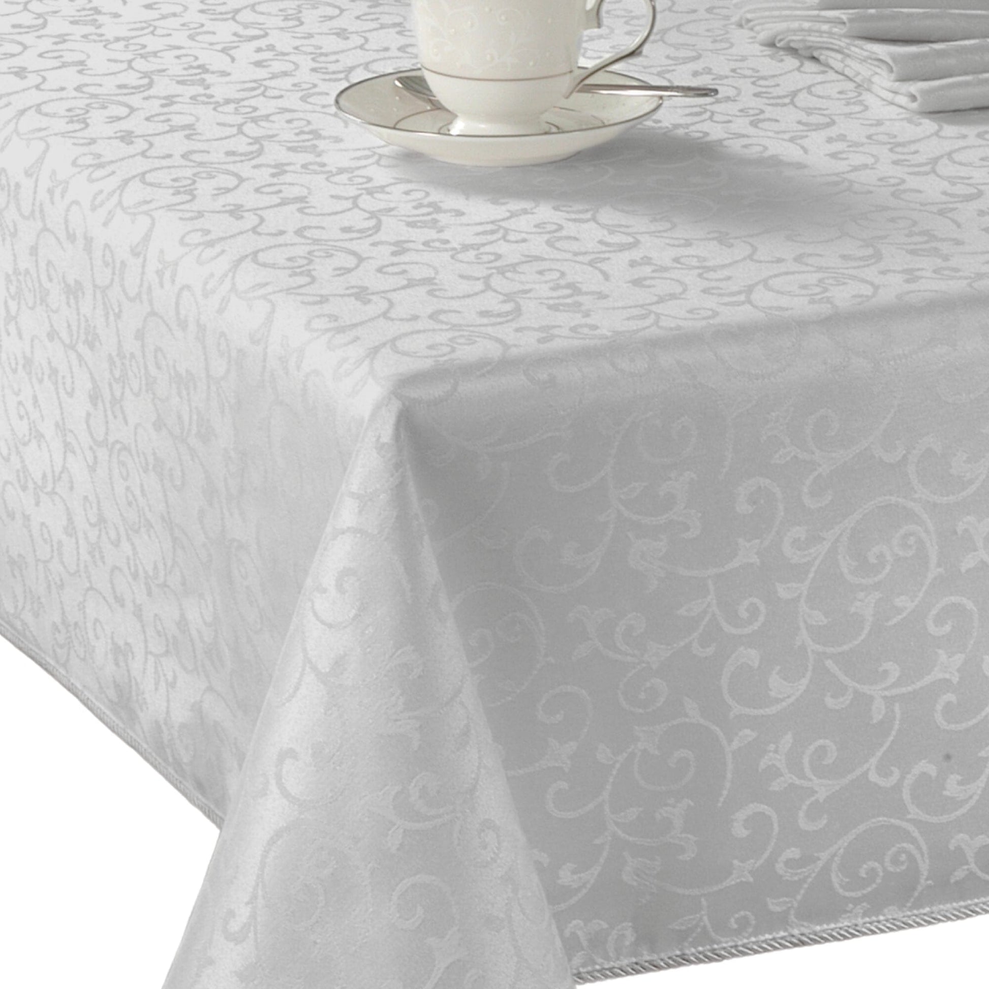 Set the table for timeless elegance with the Lenox Opal Innocence Tablecloth. Featuring a delicate damask scroll pattern and finished with a refined corded rib hem, this lustrous design is sure to bring a touch of sophistication to any occasion. Available in two versatile colorways - classic white and elegant platinum - it offers the perfect backdrop for both everyday dining and formal gatherings. Crafted from a soft yet durable poly-cotton blend, this tablecloth combines beauty with practicality and is offered in both round and rectangle sizes to fit your table with grace. Pair it with the coordinating Opal Innocence napkins, placemats, table runner and dinnerware collection to create a cohesive, elevated tablescape.